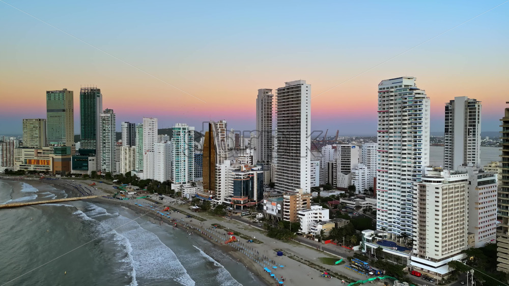 Aerial drone view of buildings alongside the Caribbean coastline in Cartagena, Colombia in the evening Royalty Free Stock Video Footage