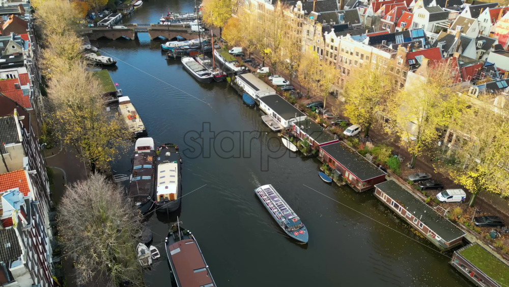Aerial drone view of buildings surrounding a tree-lined canal in Amsterdam, Netherlands in daylight Royalty Free Stock Video Footage