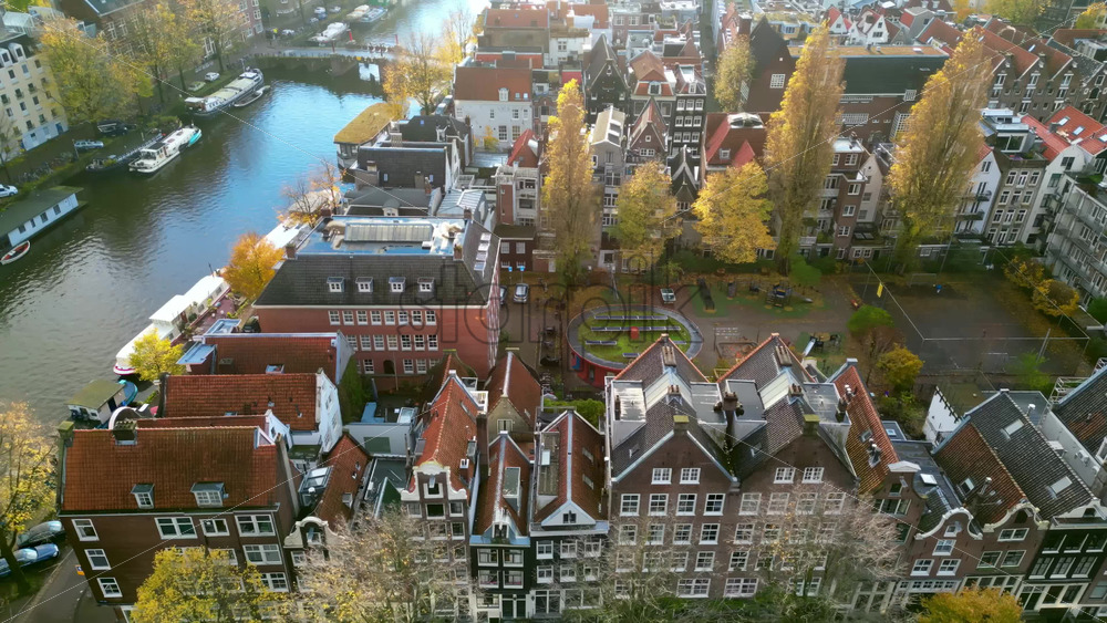 Aerial drone view of buildings surrounding a tree-lined canal in Amsterdam, Netherlands in daylight Royalty Free Stock Video Footage