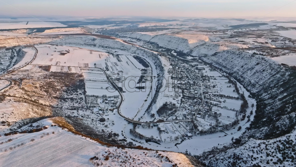 Aerial drone view of Butuceni village covered in snow at sunrise. Fields in Old Orhei during winter in Moldova Royalty Free Stock Video Footage
