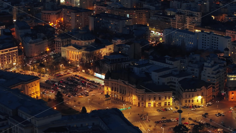 Home » Shop » 1 Video » Video – Aerial drone view of Carol I University Foundation in the night. Main building with Carol I statue in front of it, roads and buildings. Illuminated Bucharest city, Romania