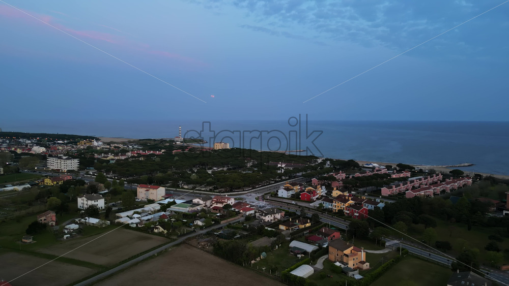 Home » Shop » 1 Video » Video – Aerial drone view of Cavallino-Treporti in the Venetian Lagoon in northern Italy in the evening
