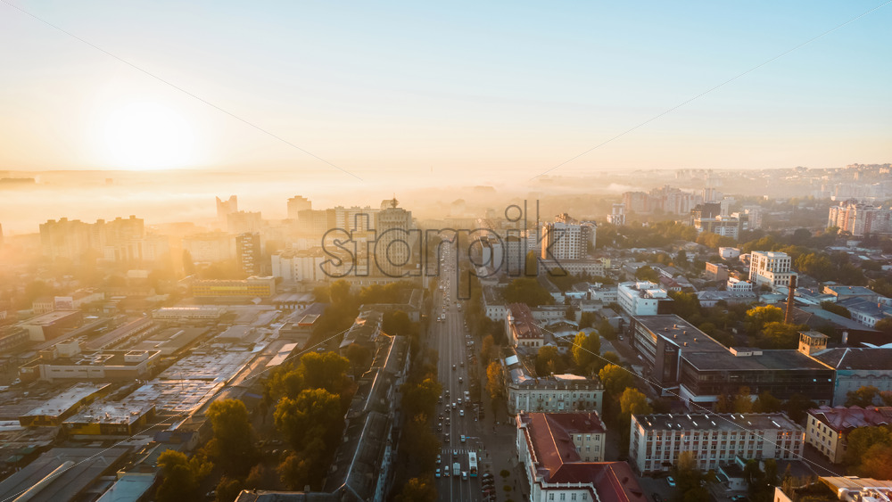 Aerial drone view of Chisinau at sunrise, Moldova. View of city centre covered with fog, multiple buildings, Bright Sun