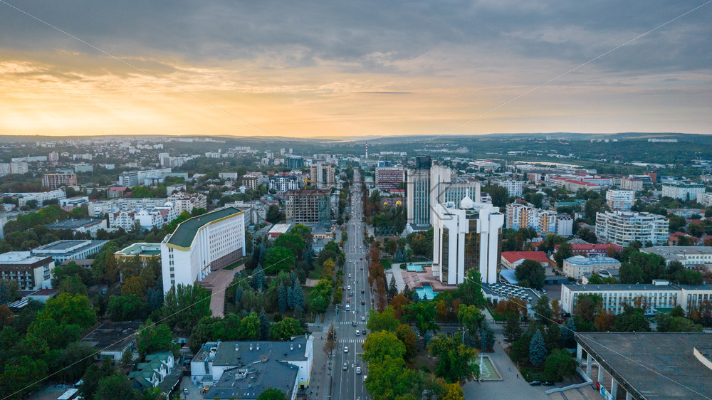 Aerial drone view of Chisinau at sunset, Moldova. View of city centre with presidency and parliament, multiple buildings, roads, lush greenery