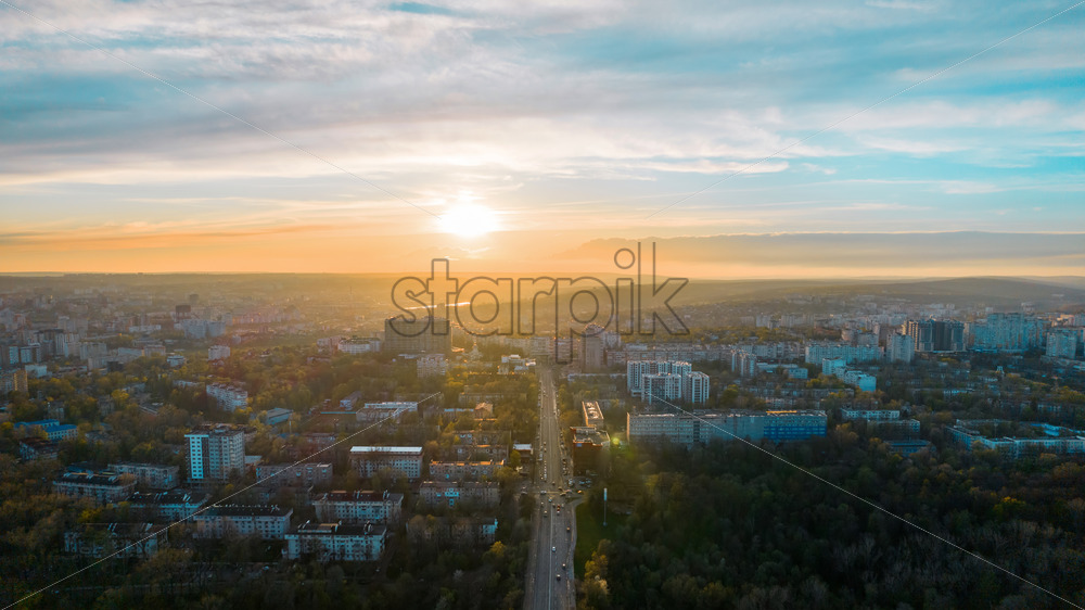 Home » Shop » photo » Aerial drone view of Chisinau at sunset, Moldova. Residential district with multiple flats, greenery, road with moving cars