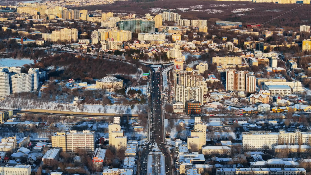 Aerial drone view of the city covered in snow. Sunrise during winter in Chisinau, Moldova Royalty Free Stock Video Footage