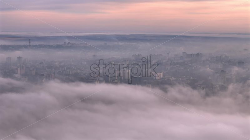 Aerial drone view of the Bell tower of the Metropolitan Cathedral of Christ’s Nativity. City center covered in snow at sunset in Chisinau, Moldova Royalty Free Stock Video Footage