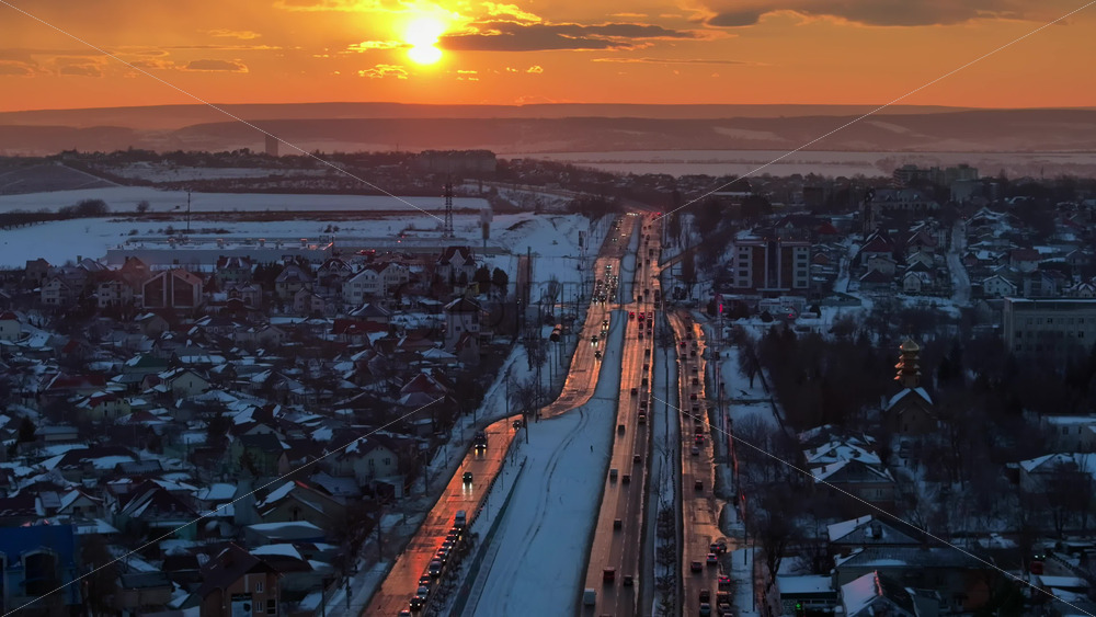Aerial drone view of Chisinau city covered in snow at sunset. Moving traffic during winter in Moldova Royalty Free Stock Video Footage