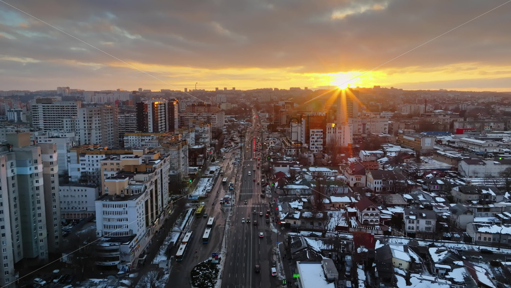 Aerial drone top view of the city covered in snow with moving traffic. Sunrise during winter in Chisinau, Moldova Royalty Free Stock Video Footage
