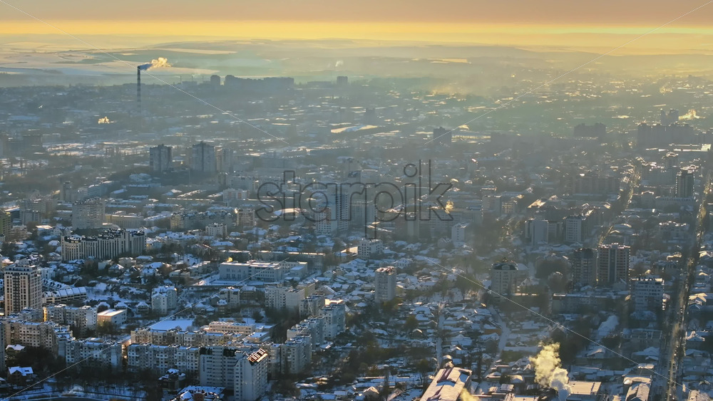 Aerial drone view of Chisinau city covered in snow at sunset. Working thermal power station in background. Winter in Moldova Royalty Free Stock Video Footage