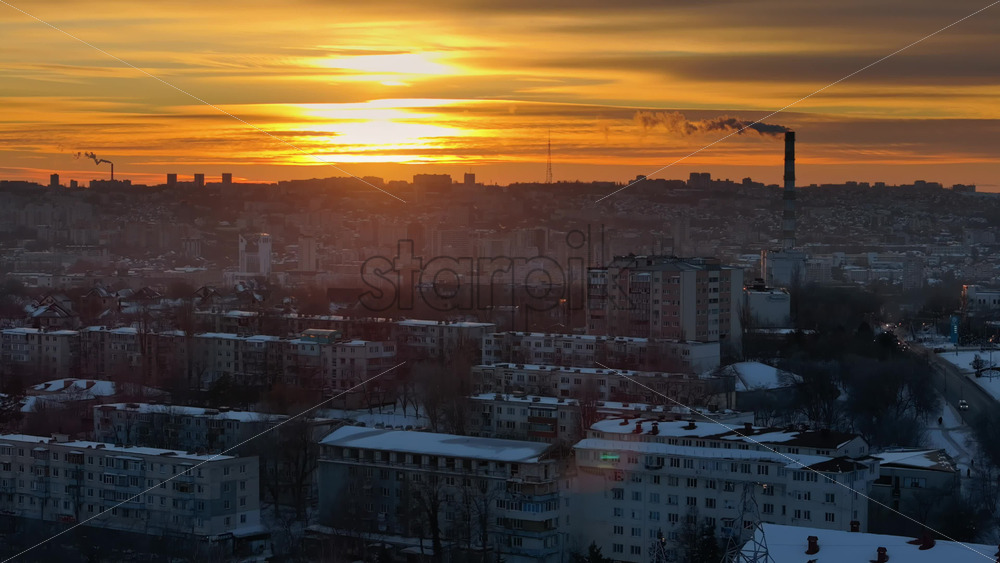 Aerial drone view of Chisinau city covered in snow at sunset. Working thermal power station in background. Winter in Moldova Royalty Free Stock Video Footage