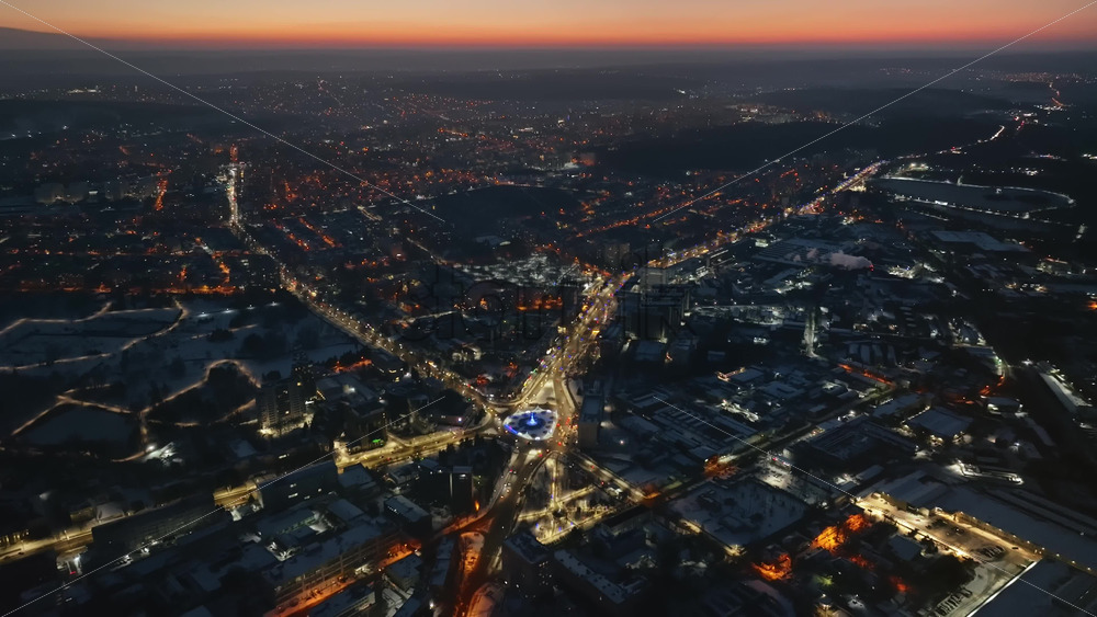 Aerial drone view of Chisinau city covered in snow with moving traffic in the evening, blue hour. Winter in Moldova Royalty Free Stock Video Footage