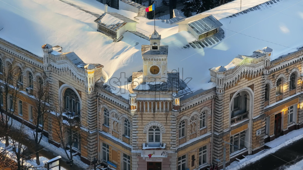 Aerial drone view of Chisinau City Hall covered in snow at sunset. Moldova Royalty Free Stock Video Footage