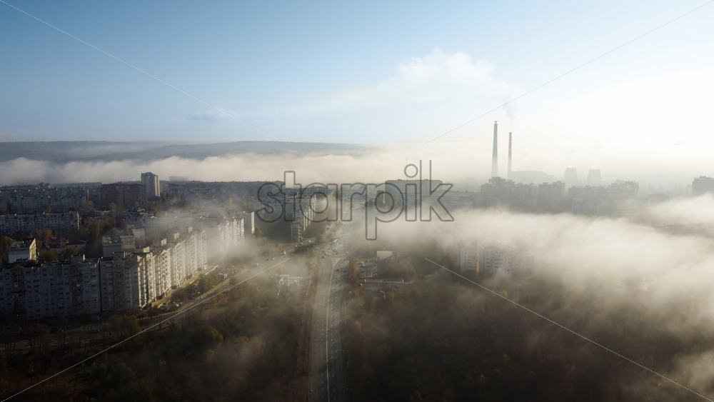 Home » Shop » photo » Aerial drone view of Chisinau, Moldova. View of city covered with fog and low clouds. Residential buildings, pipes of a thermal power plant