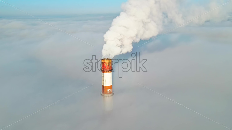 Aerial drone view of Chisinau. Tube of the thermal station with smoke coming out above the low clouds. Visible buildings. Moldova Royalty Free Stock Video Footage
