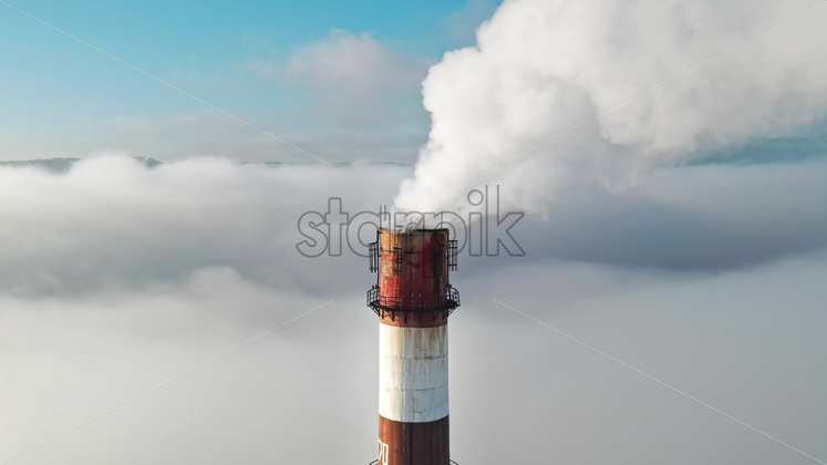 Aerial drone view of Chisinau. Tube of the thermal station with smoke coming out above the low clouds. Visible buildings. Moldova Royalty Free Stock Video Footage