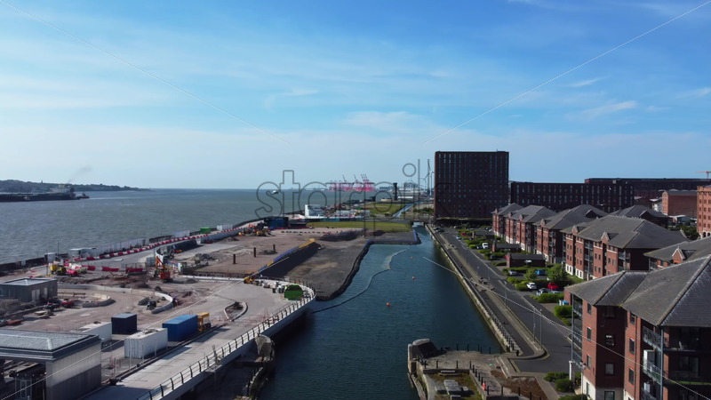 Aerial drone view of city and port of Liverpool United Kingdom Royalty Free Stock Video Footage