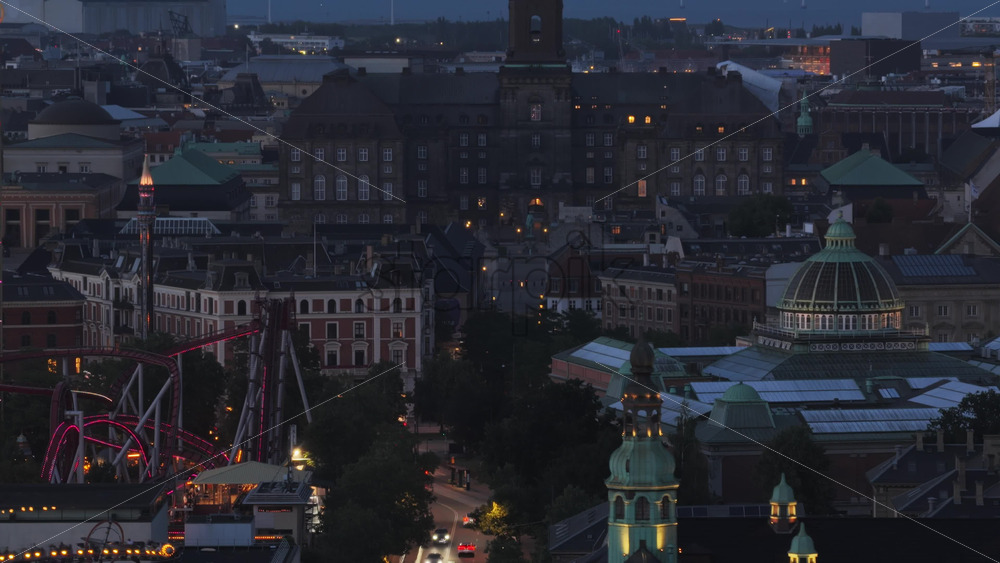 Aerial drone view of Copenhagen City Hall lit up at night with Tivoli Gardens amusement park in the background in Denmark Royalty Free Stock Video Footage