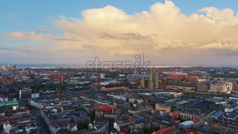 Aerial drone view of Copenhagen’s skyline at golden hour, with vibrant clouds above the city and warm sunlight illuminating the horizon Royalty Free Stock Video Footage