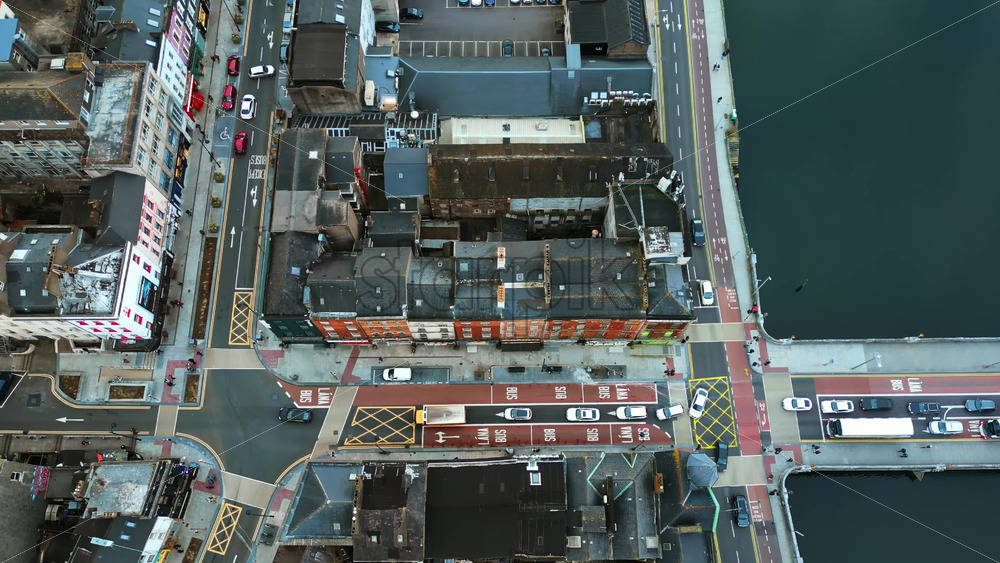 Aerial drone view of Cork’s River Lee and its iconic bridges flowing through the city center, with dense architecture and traffic movement Royalty Free Stock Video Footage