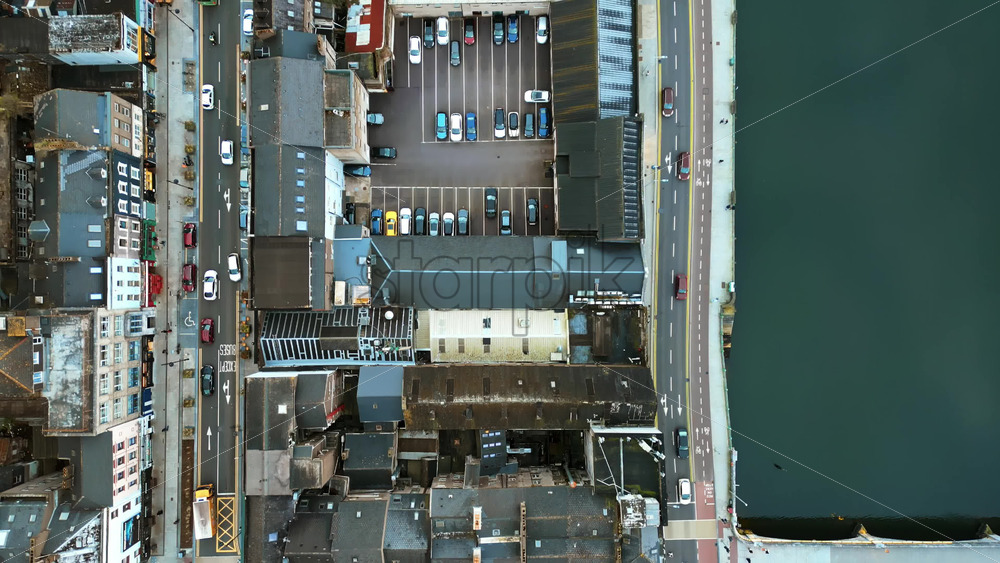 Aerial drone view of cars driving over the buildings surrounding River Lagan in Belfast, Northern Ireland Royalty Free Stock Video Footage
