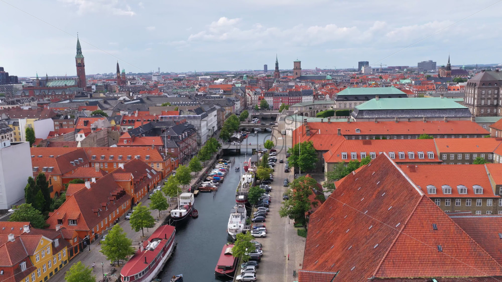 Aerial drone view of historic Christianshavn canal lined with boats and red-roofed buildings, with Copenhagen’s skyline in the distance in Denmark Royalty Free Stock Video Footage