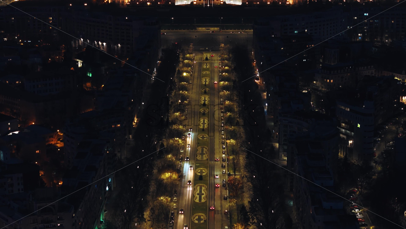 Aerial drone view of illuminated Palace of the Parliament in Bucharest downtown in the evening. mp4ing traffic on the road. Romania Royalty Free Stock Video Footage