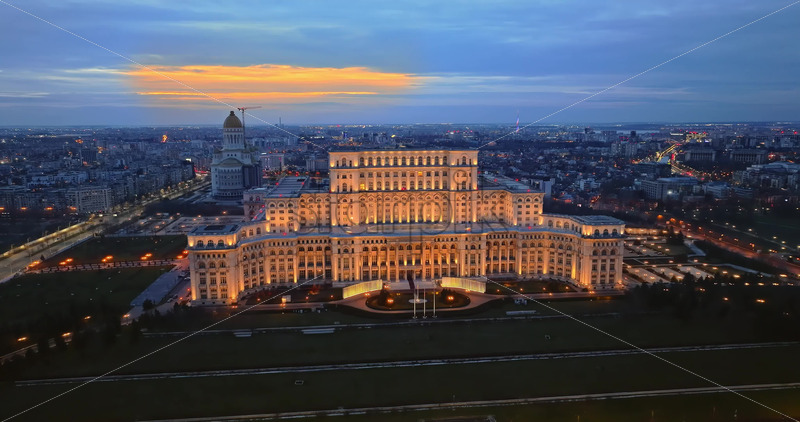 Aerial drone view of illuminated Palace of the Parliament in Bucharest downtown in the evening. Multiple districts around. Romania Royalty Free Stock Video Footage