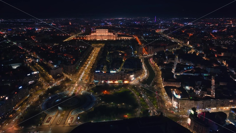 Aerial drone view of illuminated Palace of the Parliament in city downtown in the night. Multiple districts around Royalty Free Stock Video Footage