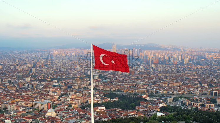 Aerial drone view of Istanbul at sunset, Turkey. Camlica Hill with national flags, greenery, cityscape on the background Royalty Free Stock Video Footage