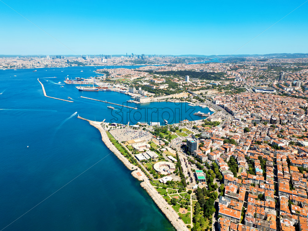 Aerial drone view of Istanbul, Turkey. Bosporus strait, sea port, multiple buildings, downtown on the background