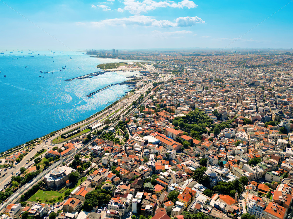 Aerial drone view of Istanbul, Turkey. Bosporus strait with multiple floating ships, sea port, multiple buildings
