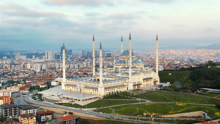 Aerial drone view of Istanbul, Turkey. Halic Bridge with multiple moving cars, multiple residential buildings on the both sides of the Golden Horn waterway, floating boat, greenery Royalty Free Stock Video Footage
