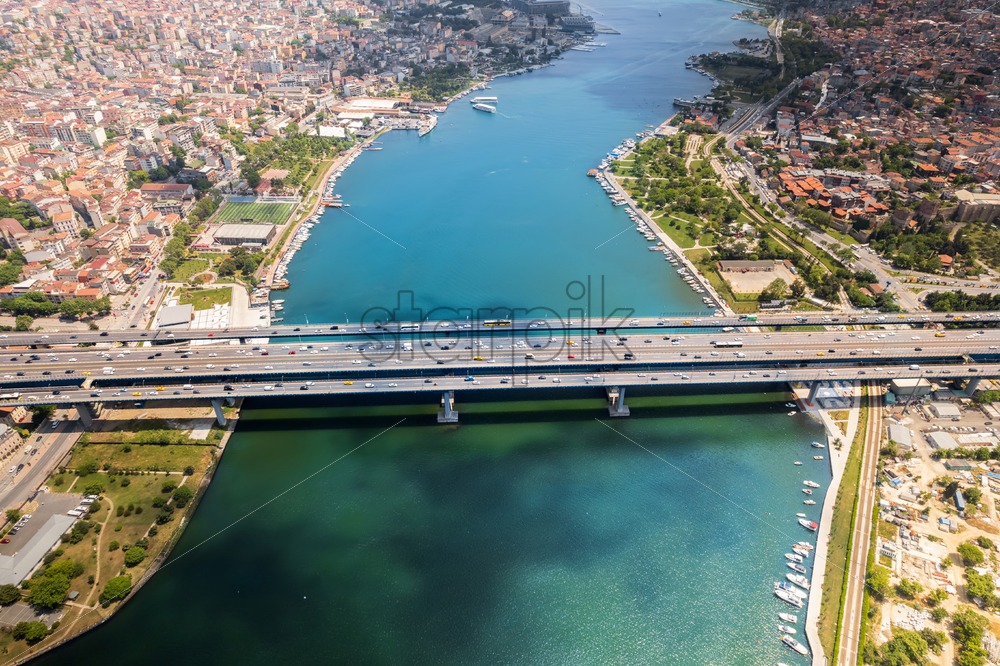 Aerial drone view of Istanbul, Turkey. Halic Bridge with multiple moving cars, multiple residential buildings on the both sides of the Golden Horn waterway, greenery