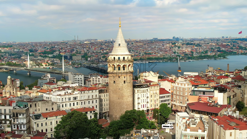 Aerial drone view of Istanbul at sunset, Turkey. Multiple residential buildings, mosques, Galata and Metro bridges over the Golden Horn waterway with floating ships