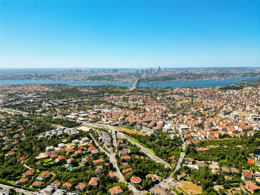 Aerial drone view of Istanbul, Turkey. Residential district with multiple residential buildings and greenery, Golden Horn waterway, downtown on the background