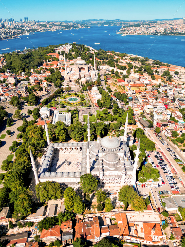 Aerial drone view of Istanbul, Turkey. Sultanahmet district with Blue mosque, Hagia Sophia and greenery, Bosphorus strait in the distance