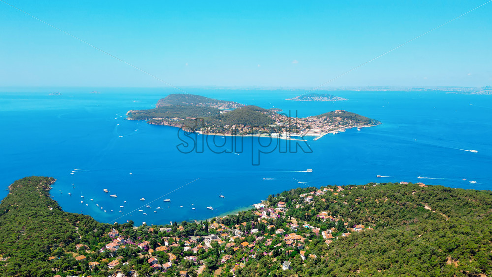 Aerial drone view of Kinaliada, Turkey. Residential buildings located on the shore of Marmara sea, other islands in the distance