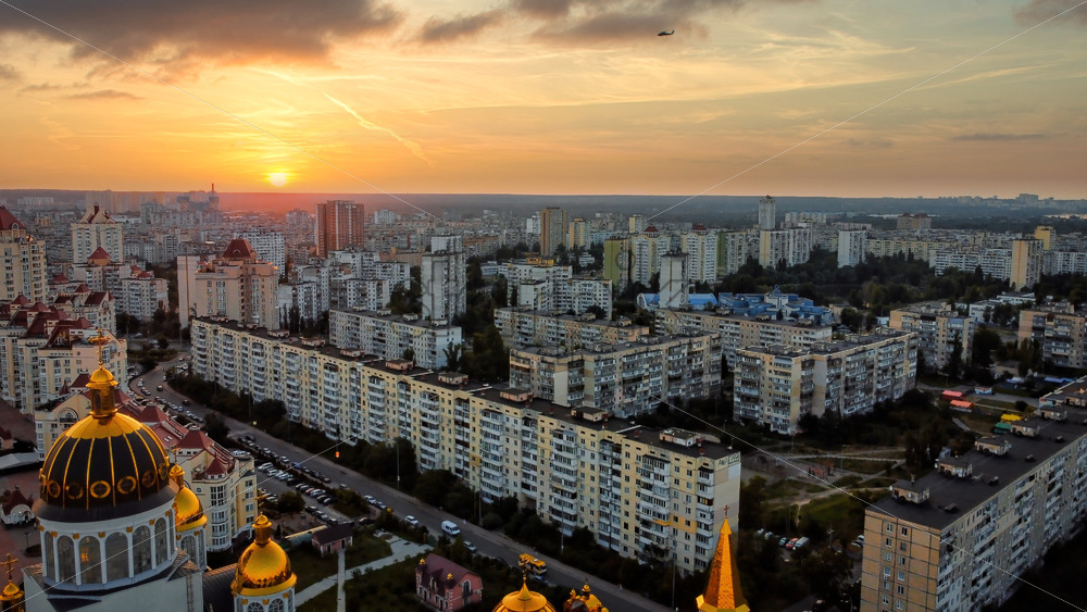 Aerial drone view of Kyiv, Ukraine at sunset. Holy Intercession Cathedral, residential buildings, roads with cars