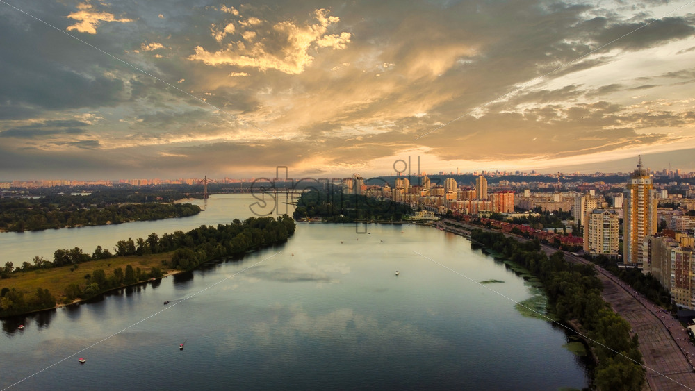Home » Shop » photo » Aerial drone view of Kyiv, Ukraine at sunset. River Dnieper, residential buildings, a lot of greenery