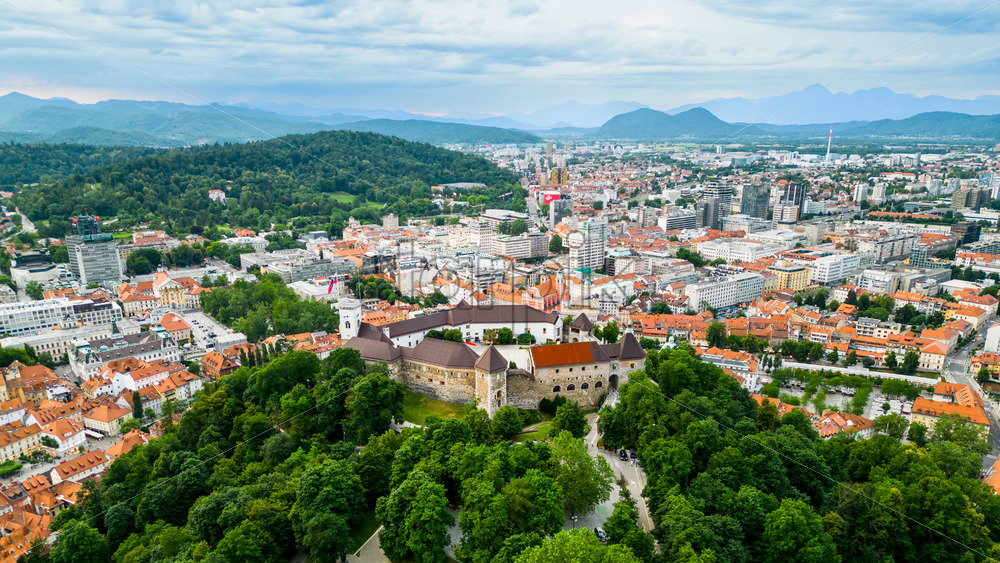 Aerial drone view of Ljubljana, Slovenia. Historical city centre with Ljubljana Castle, lush greenery and multiple residential buildings, hills on the background