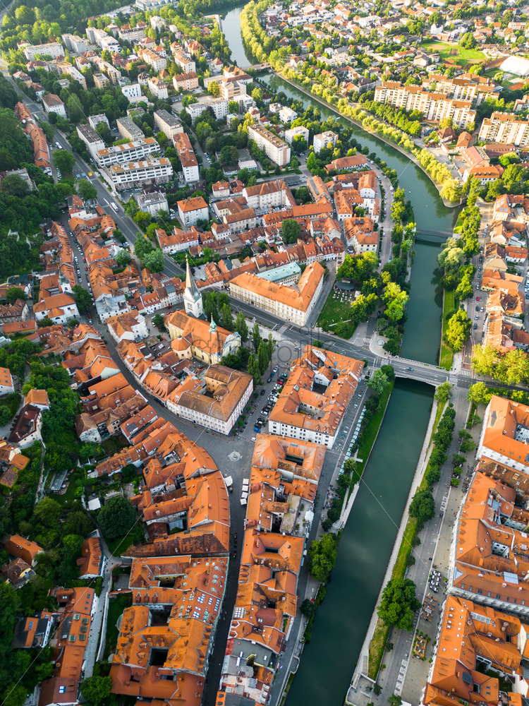 Aerial drone view of Ljubljana, Slovenia. Historical city centre with Ljubljanica river, greenery and multiple old buildings