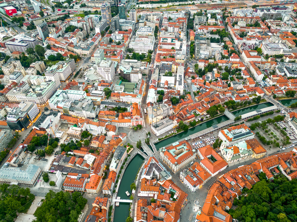 Home » Shop » photo » Aerial drone view of Ljubljana, Slovenia. Historical city centre with Ljubljanica river, greenery and multiple old buildings