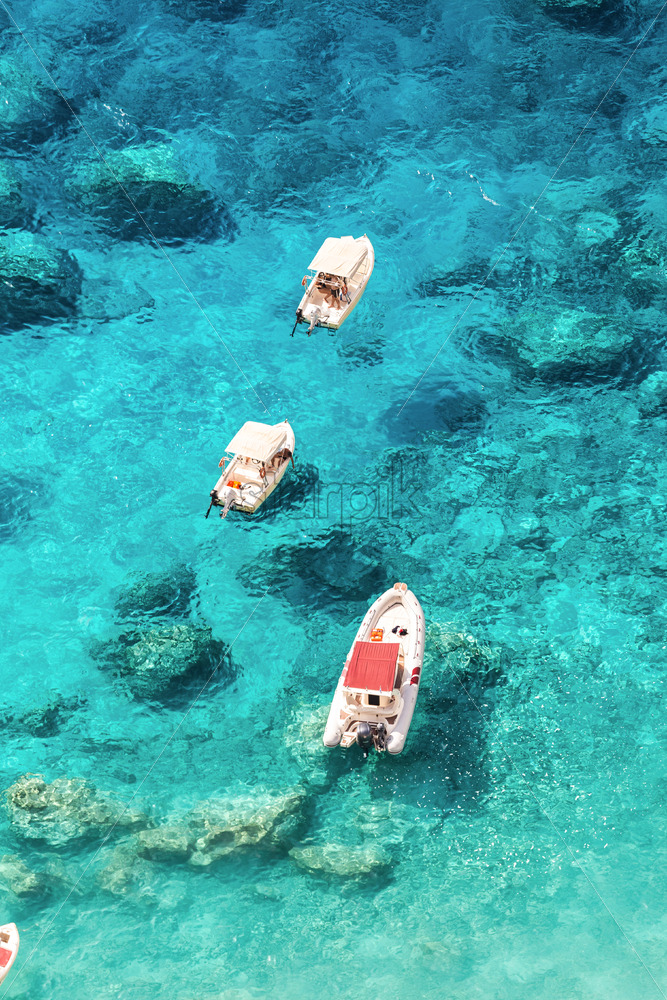 Aerial drone view of moored boats near the coast of Zakynthos, Greece. Blue and transparent water of Ionian sea
