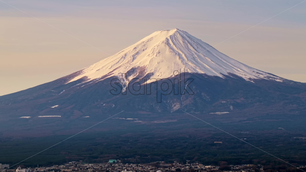 video Aerial drone view of Mount Fuji with snow at the top and clouds moving around at sunset Royalty Free Stock Video Footage