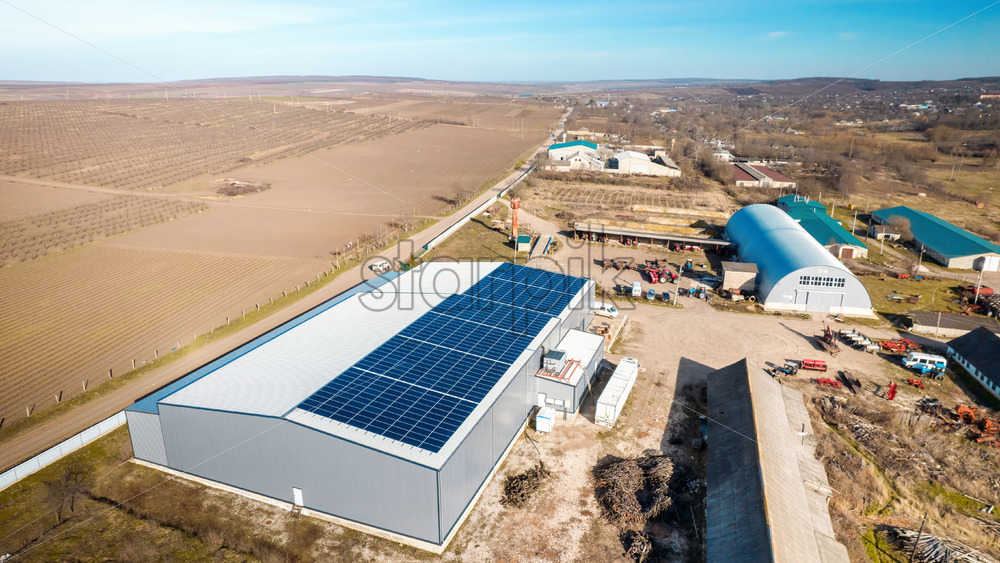 Home » Shop » photo » Aerial drone view of multiple solar panels on the roof of a manufacturing building in nature. Ecology thematics
