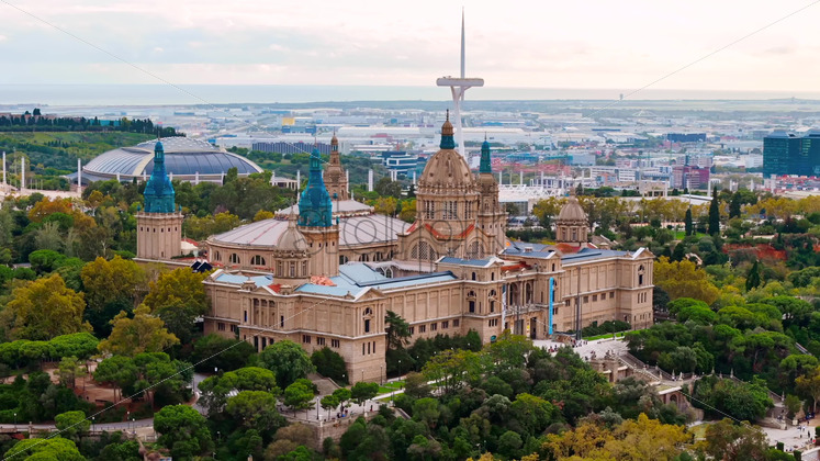 Aerial drone view of National Art Museum of Catalonia in Barcelona, Spain. Greenery around Royalty Free Stock Video Footage