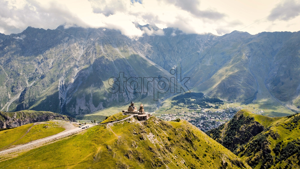 Aerial drone view of nature in Georgia. Caucasus Mountains, Gergeti Trinity Church located on the top of a hill, greenery, valley, village on the background