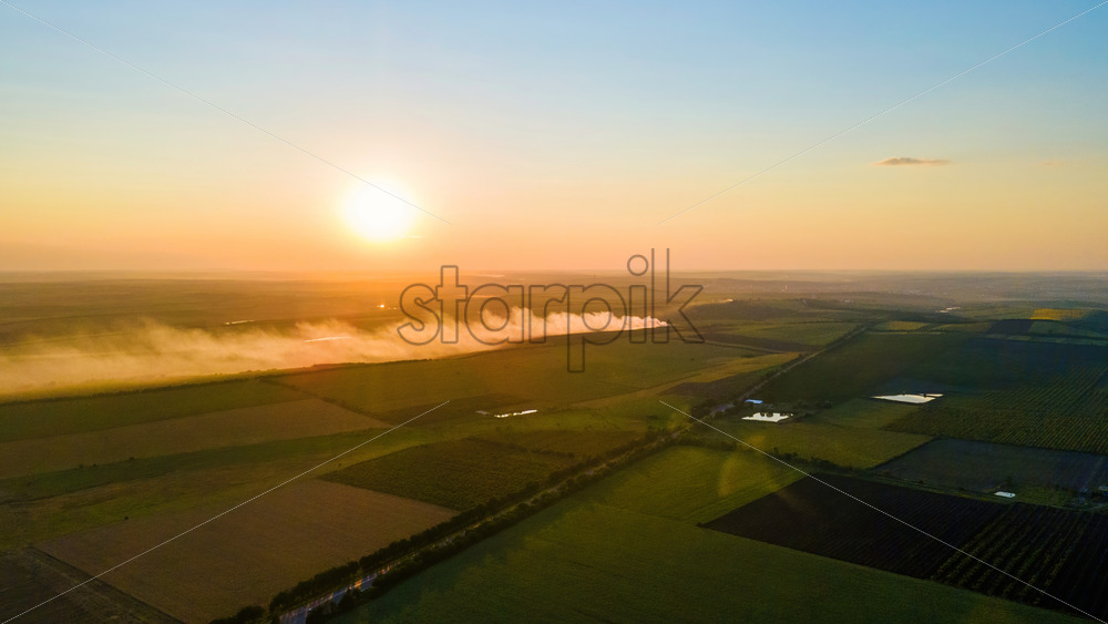 Aerial drone view of nature in Moldova at sunset. Smoke from a fire, wide fields, road, sun
