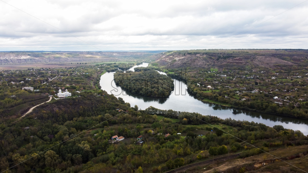 Aerial drone view of nature in Moldova. Dniester river with an island, green trees around